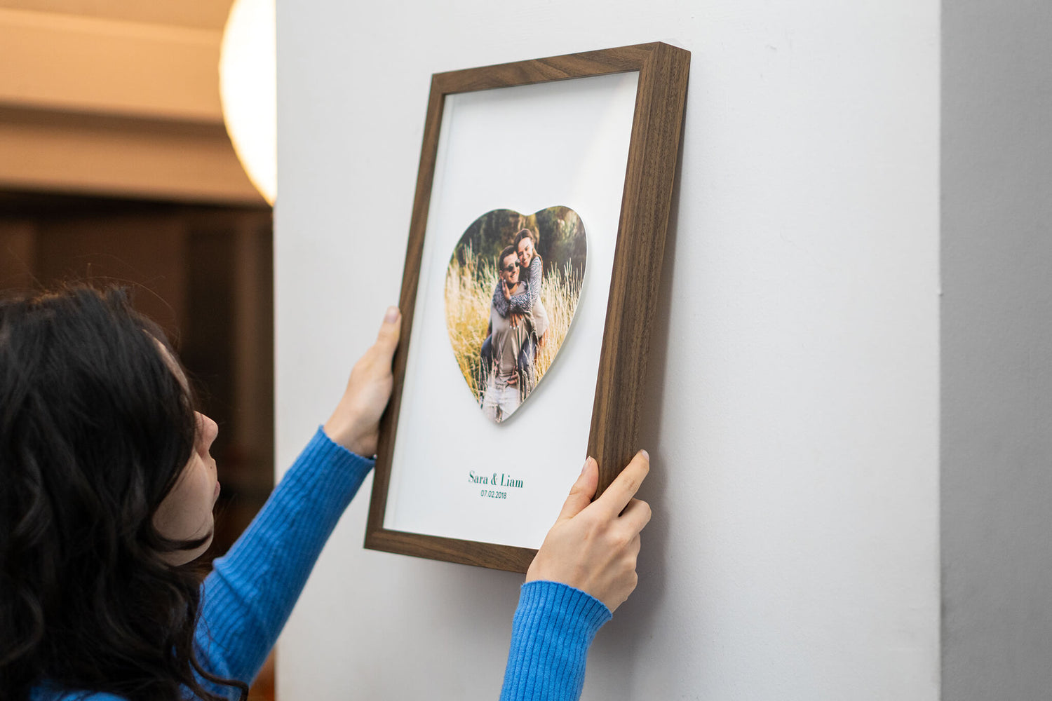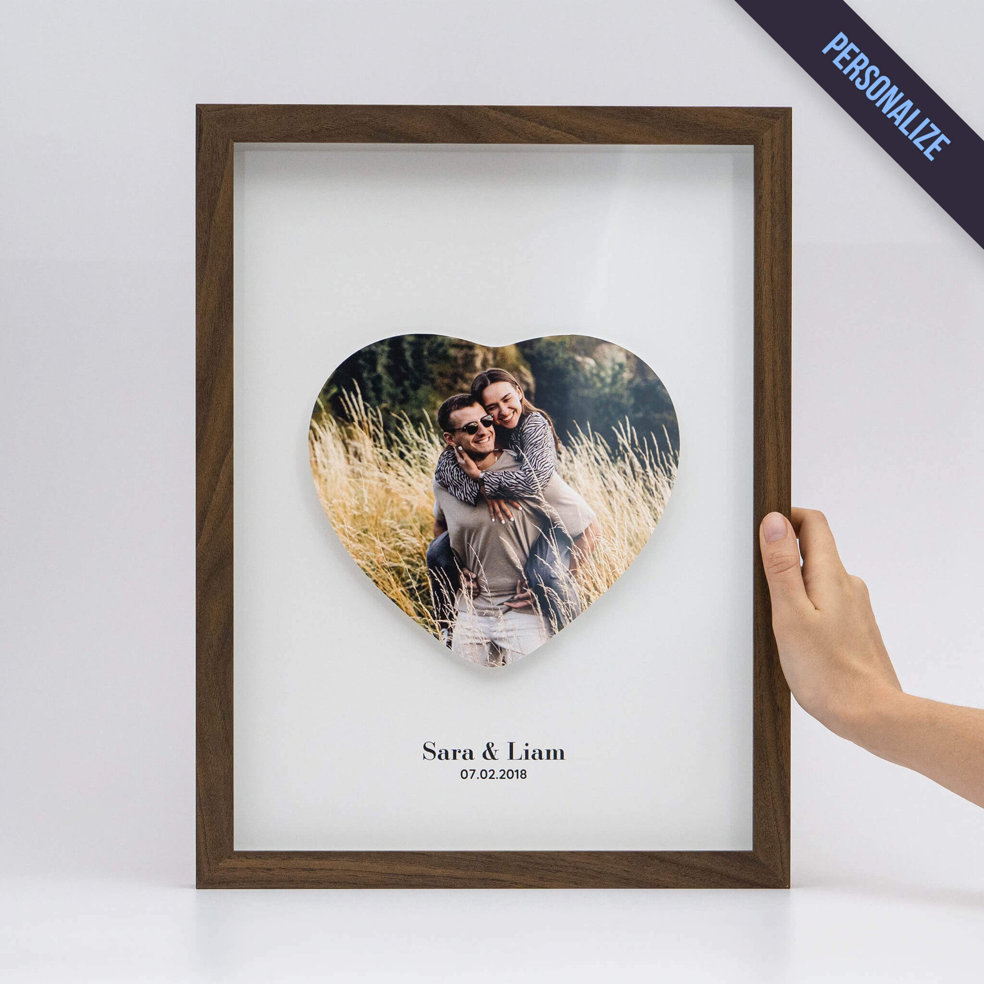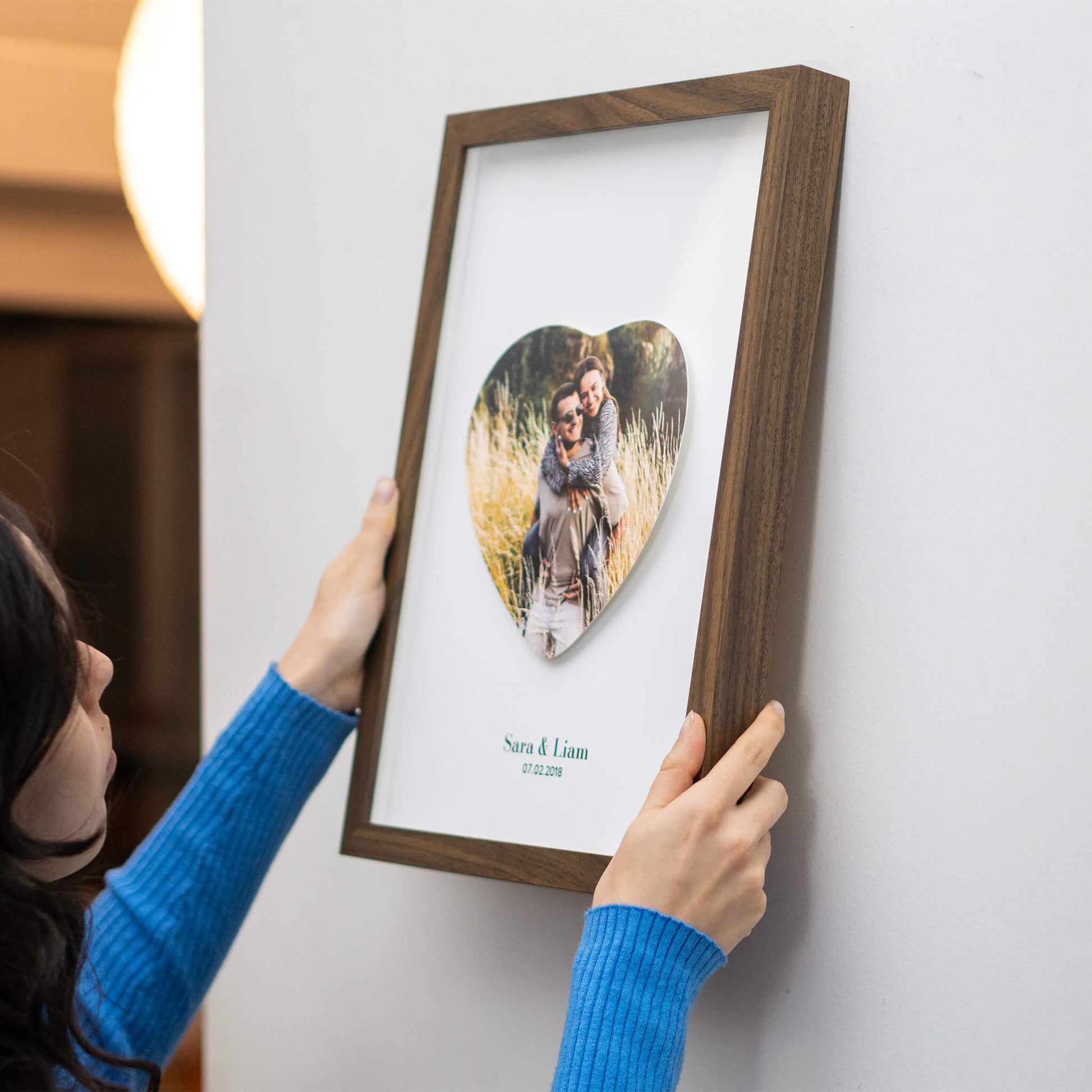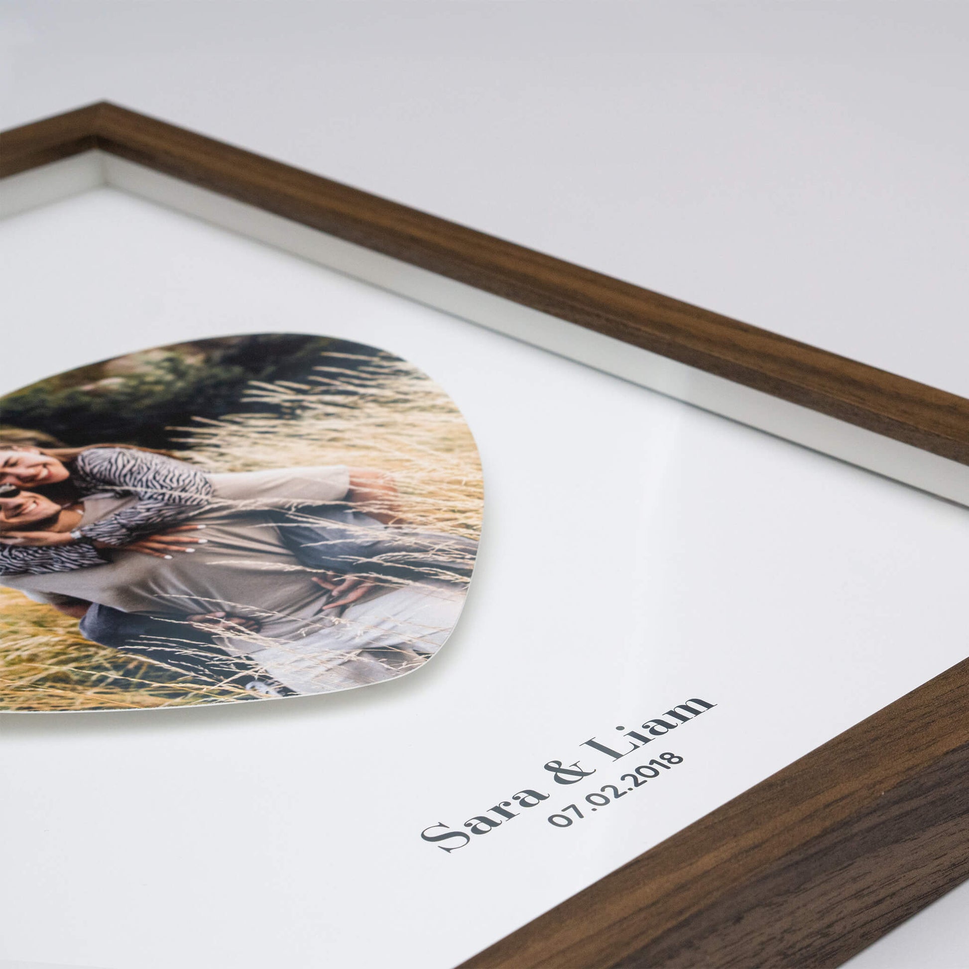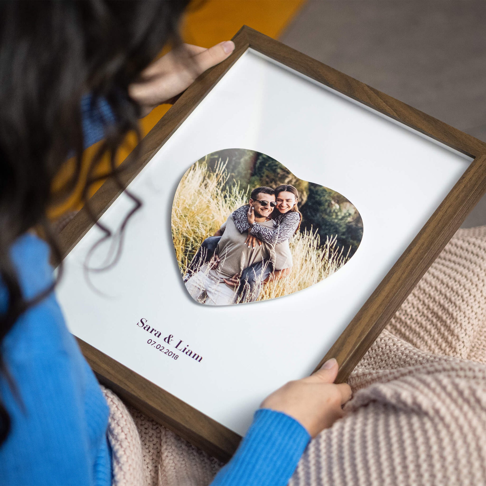 Honor your special moments as a couple with our elegantly designed art piece featuring a heart-shaped photo. The photo is mounted 6mm (¼") above a pristine white background, giving the appearance that it's floating. The background is personalized with your names and a significant date—be it your first meeting, engagement, or wedding day. It’s a celebration of your journey together, making it an ideal gift for anniversaries, Valentine’s Day, or as a memorable wedding present.