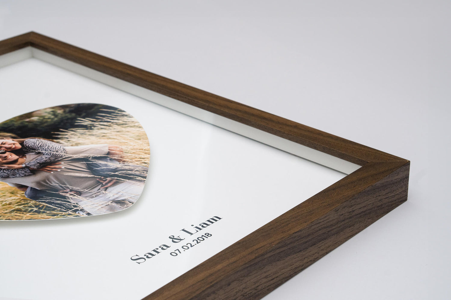 - Single heart-shaped photo is elegantly mounted 6mm above the pristine background