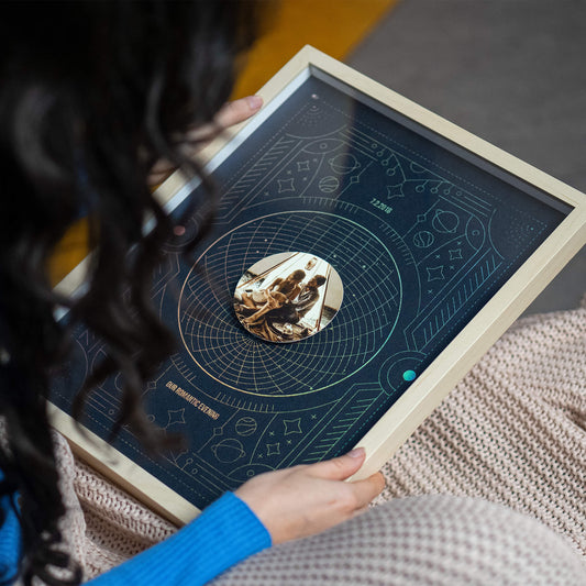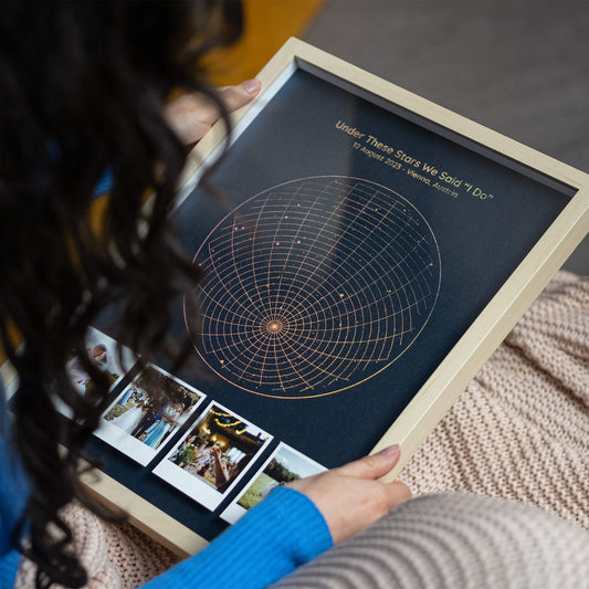Vyberte si akýkoľvek významný dátum a my zachytíme súhvezdia konkrétnej noci pomocou holografickej fólie, ktorá sa trbliece rovnako ako hviezdy na oblohe.