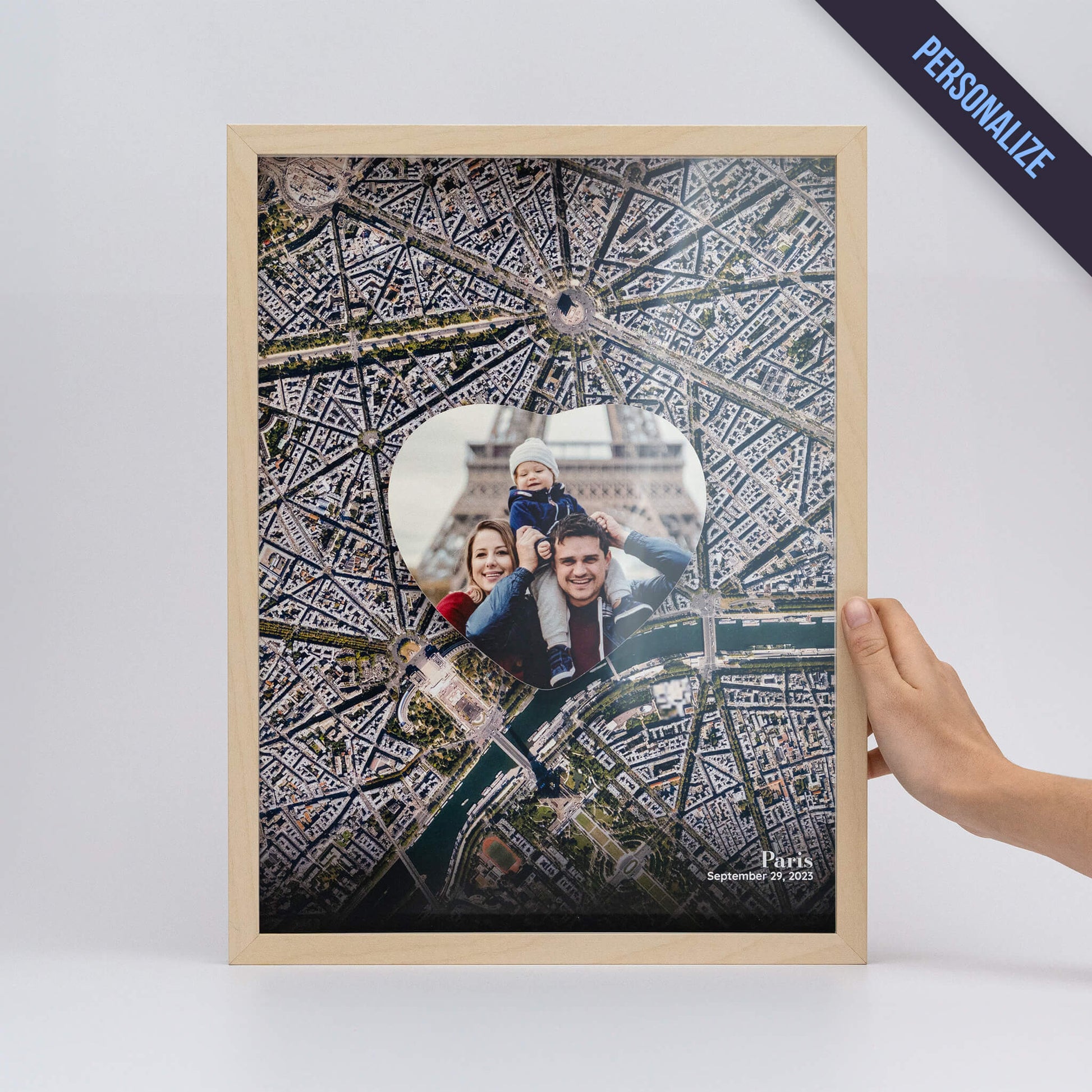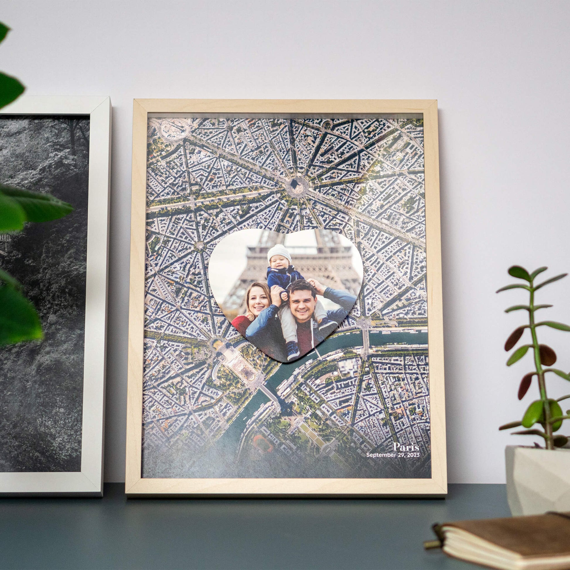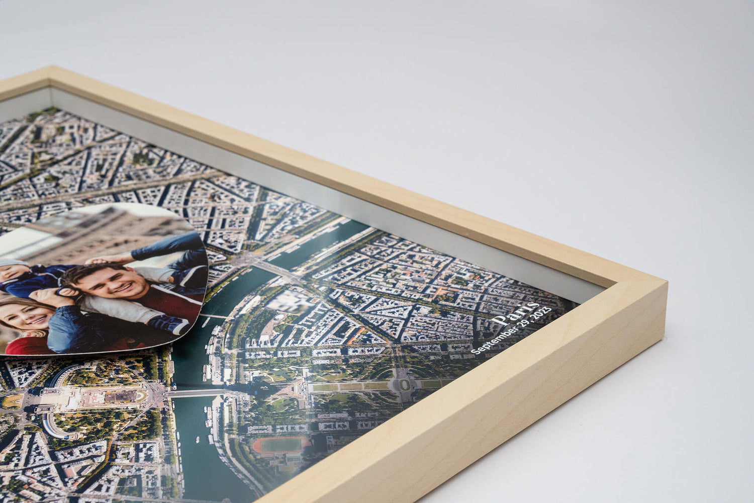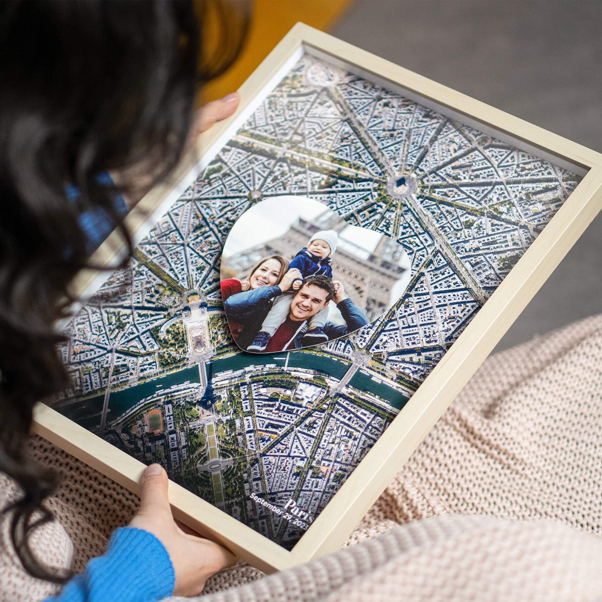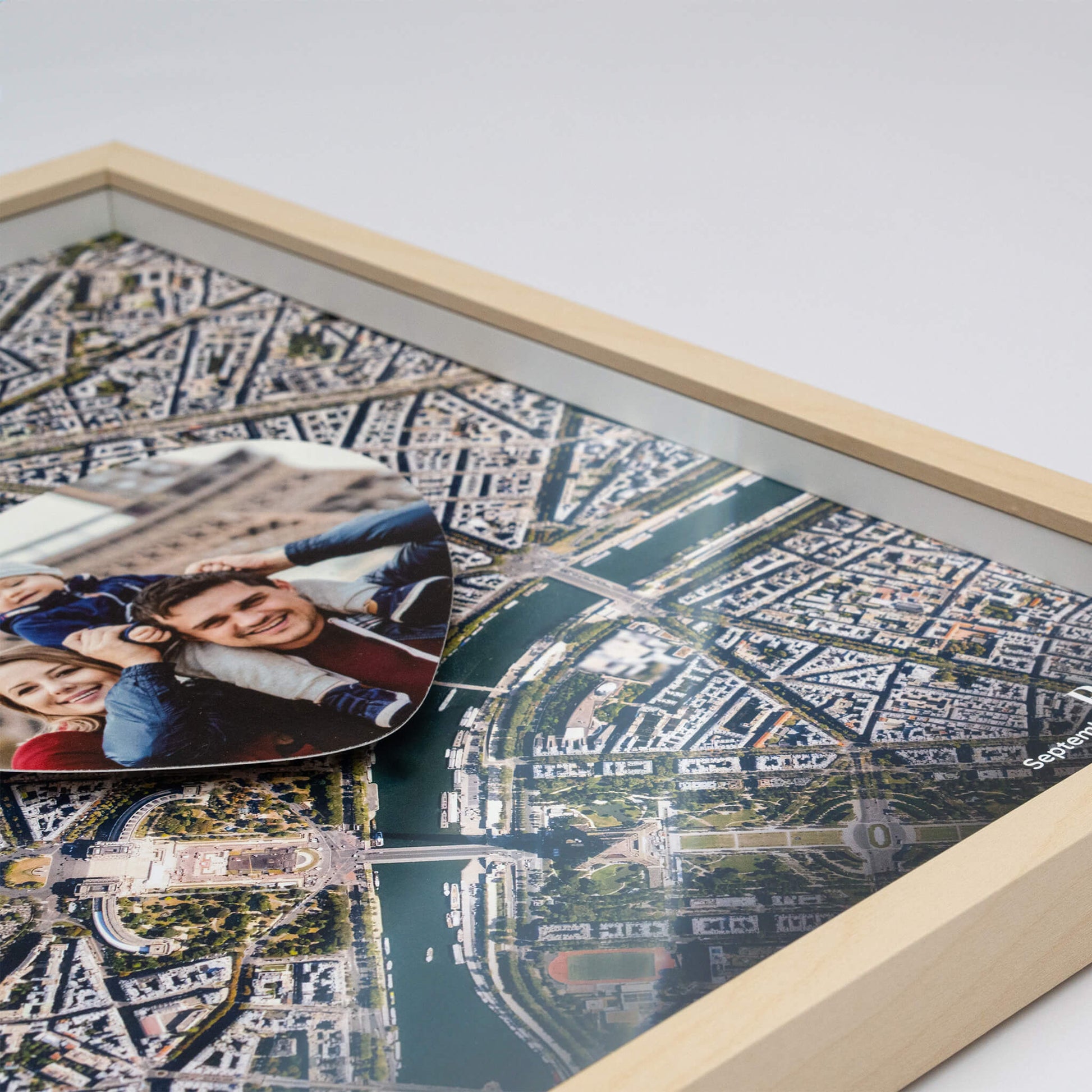 Vyberte si ľubovoľné miesto na svete, ktoré poslúži ako pozadie pre vaše obľúbené fotografie, ktoré sú elegantne uchytené 6 mm nad mapou, čím vytvárajú dojem, že sa vznášajú nad povrchom. Tento elegantný obraz zachytáva vaše dobrodružstvá a slúži ako ideálna dekorácia do interiéru alebo ako nápaditý darček, ktorý oslávi okamihy z vašich dovoleniek.