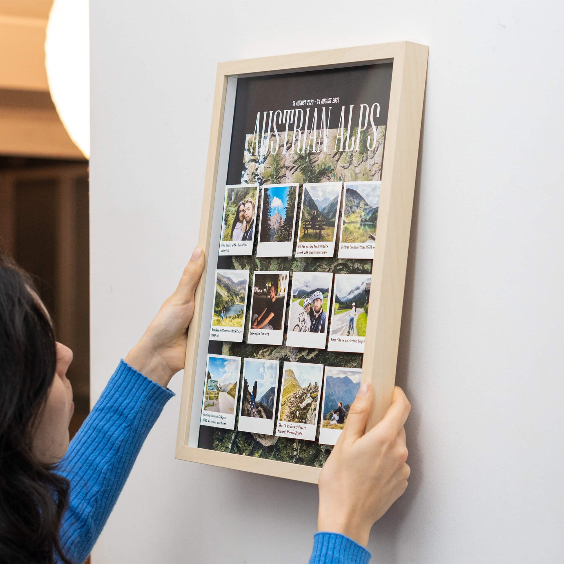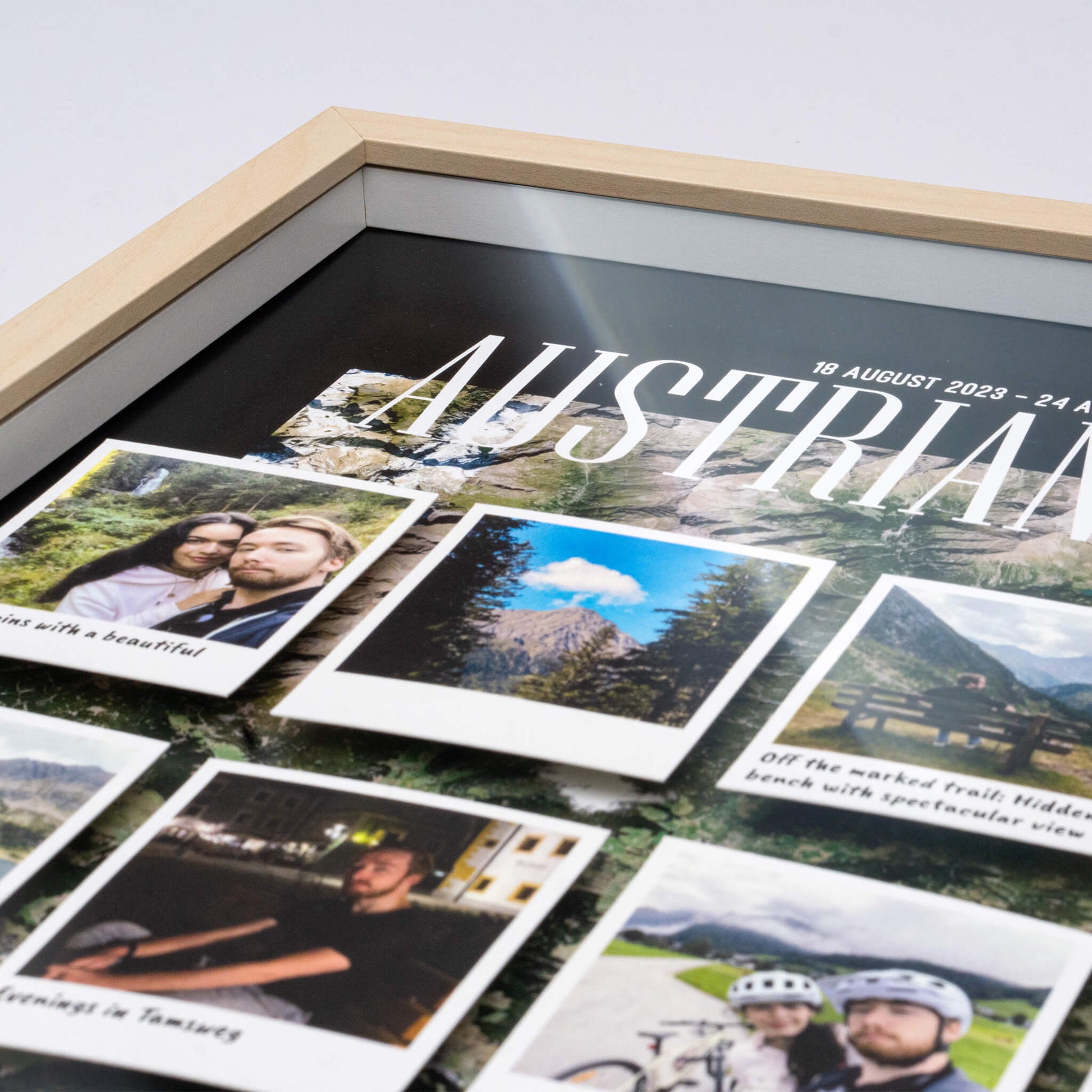 Vyberte si ľubovoľné miesto na svete, ktoré poslúži ako pozadie pre vaše obľúbené fotografie, ktoré sú elegantne uchytené 6 mm nad mapou, čím vytvárajú dojem, že sa vznášajú nad povrchom. Tento elegantný obraz zachytáva vaše dobrodružstvá a slúži ako ideálna dekorácia do interiéru alebo ako nápaditý darček, ktorý oslávi okamihy z vašich dovoleniek.