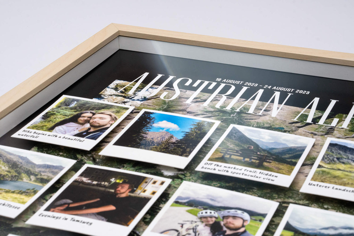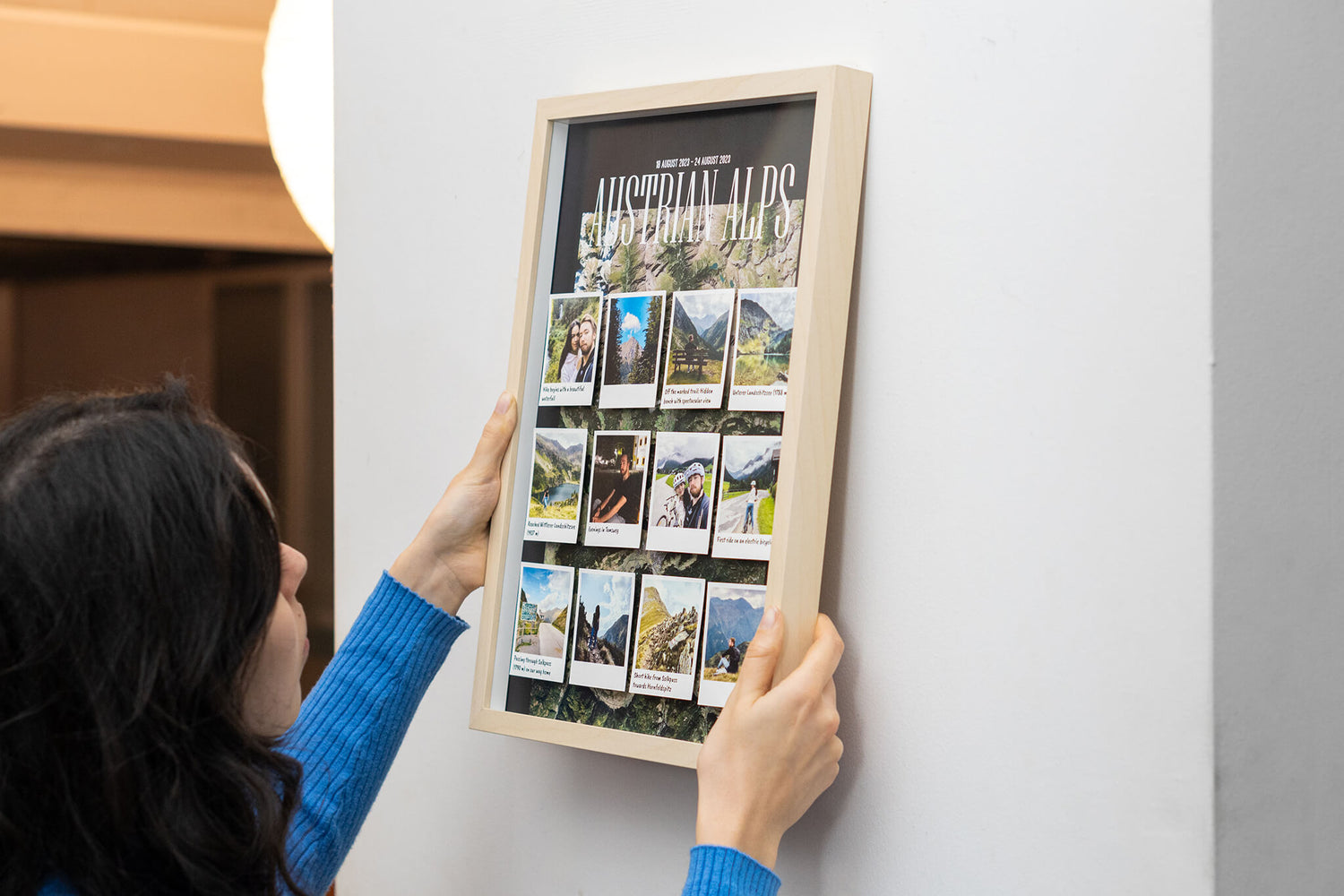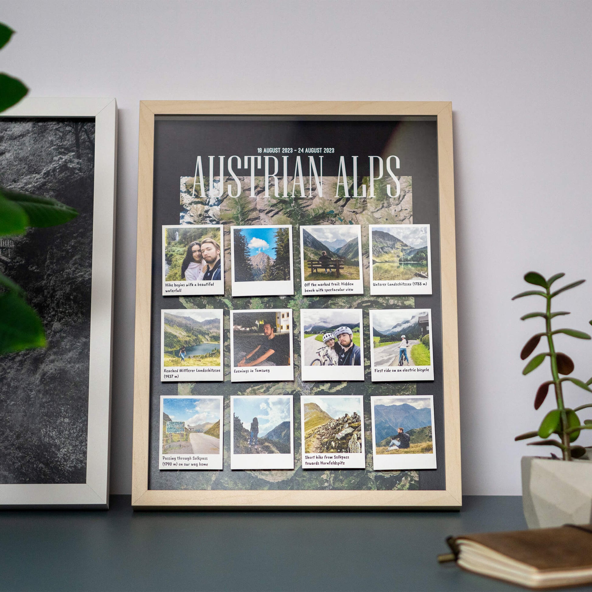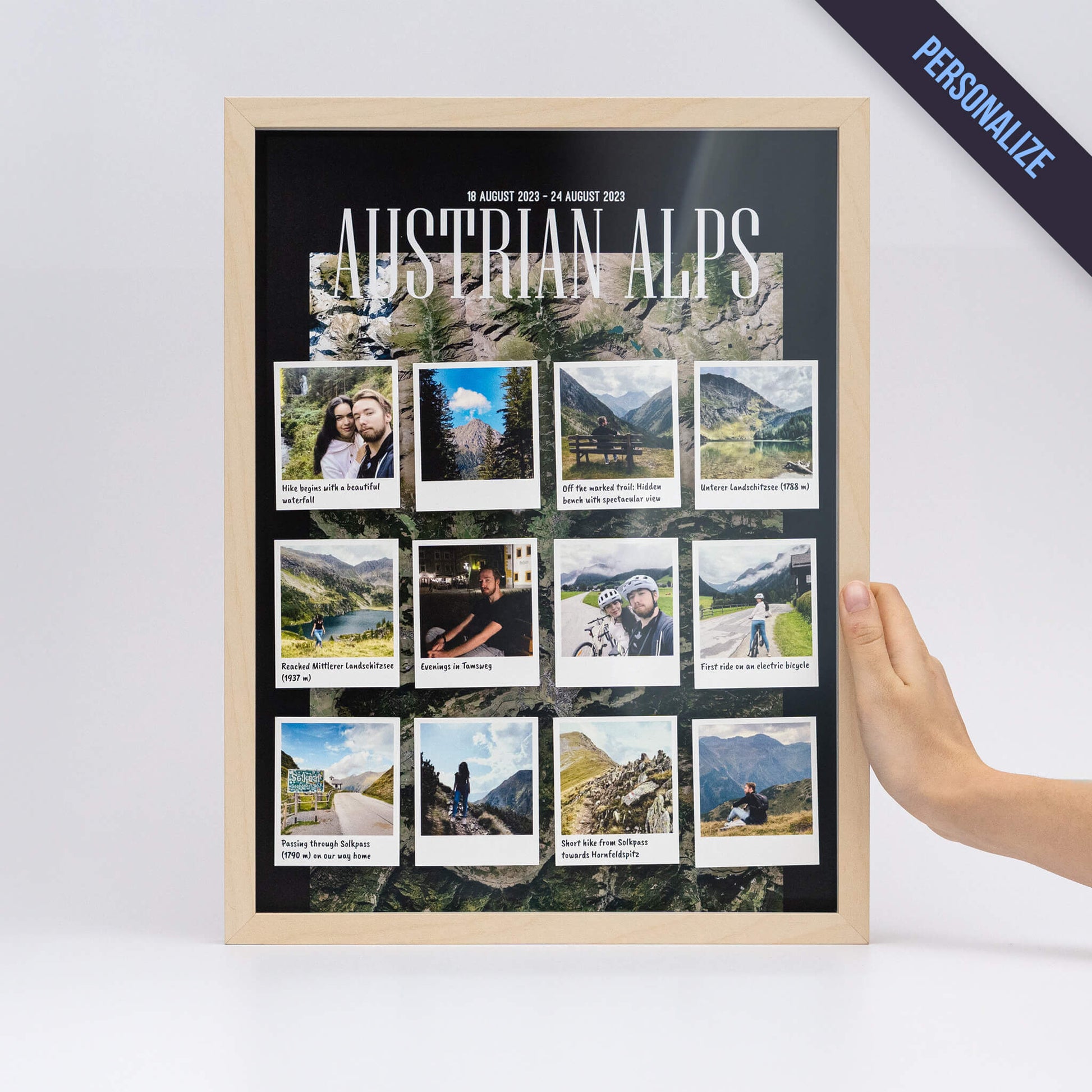 Obraz si personalizujete pomocou mapy ľubovoľného miesta na svete a 12 vlastných fotografií, vďaka čomu sa stane dokonalou spomienkou na vaše významné výlety a dovolenky.