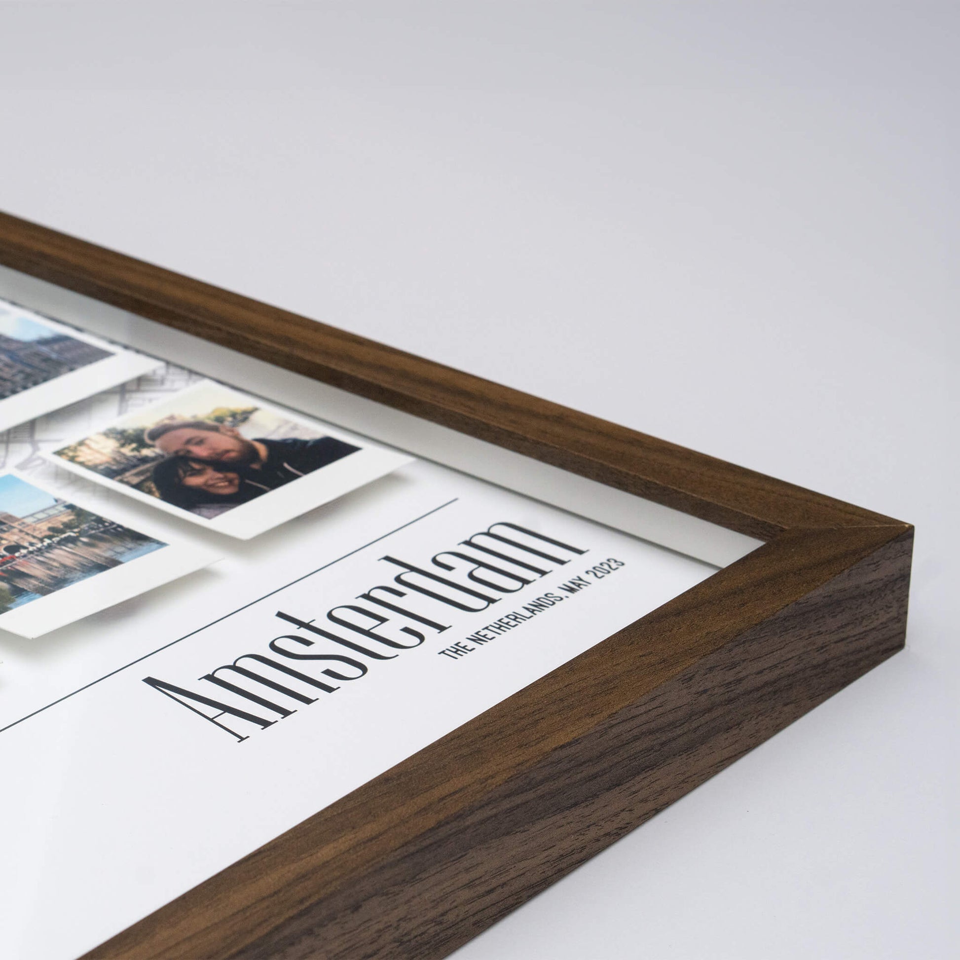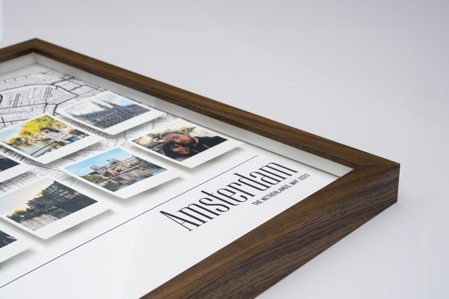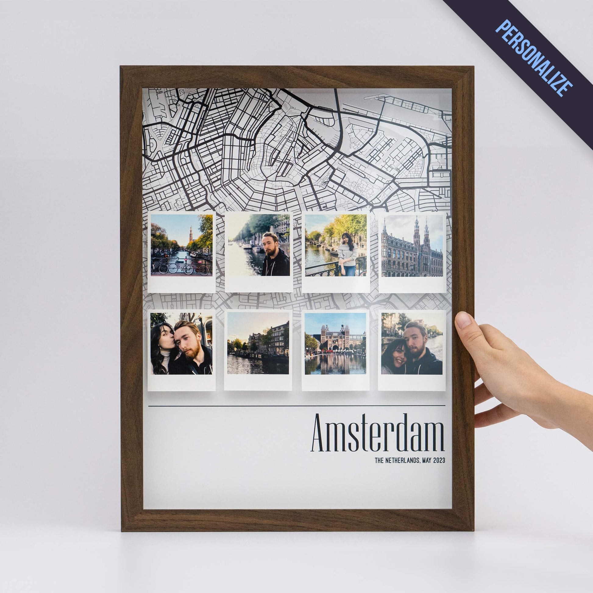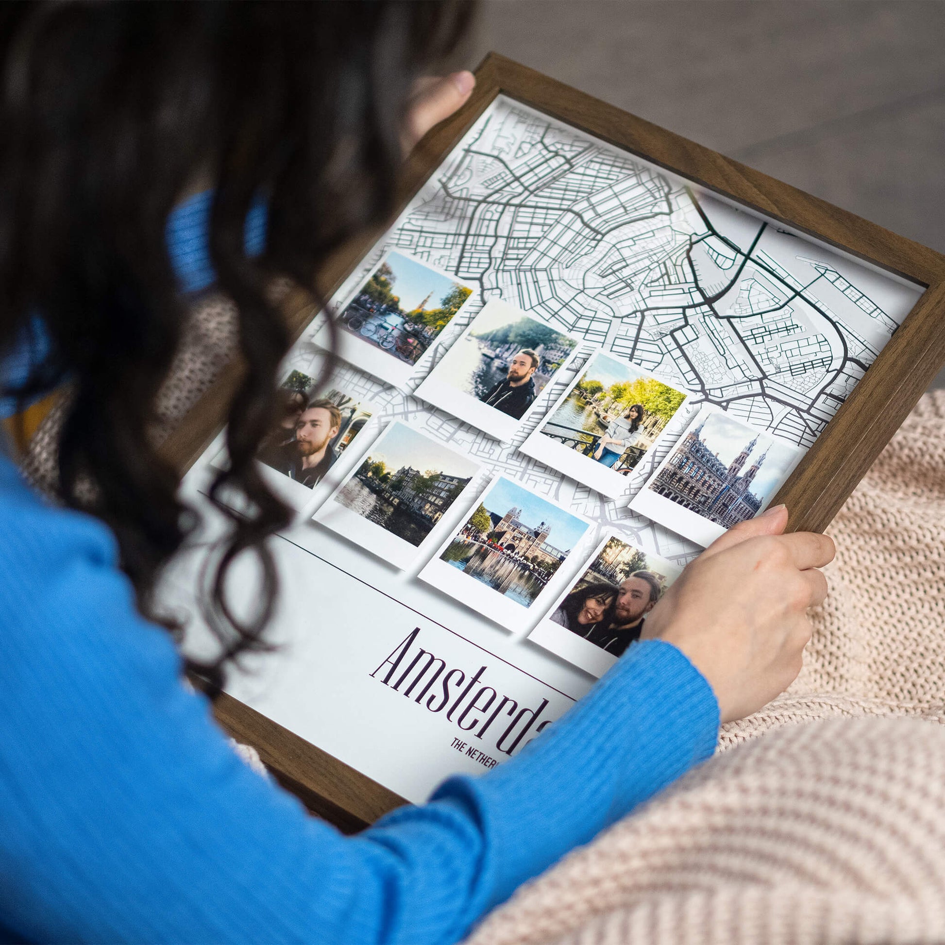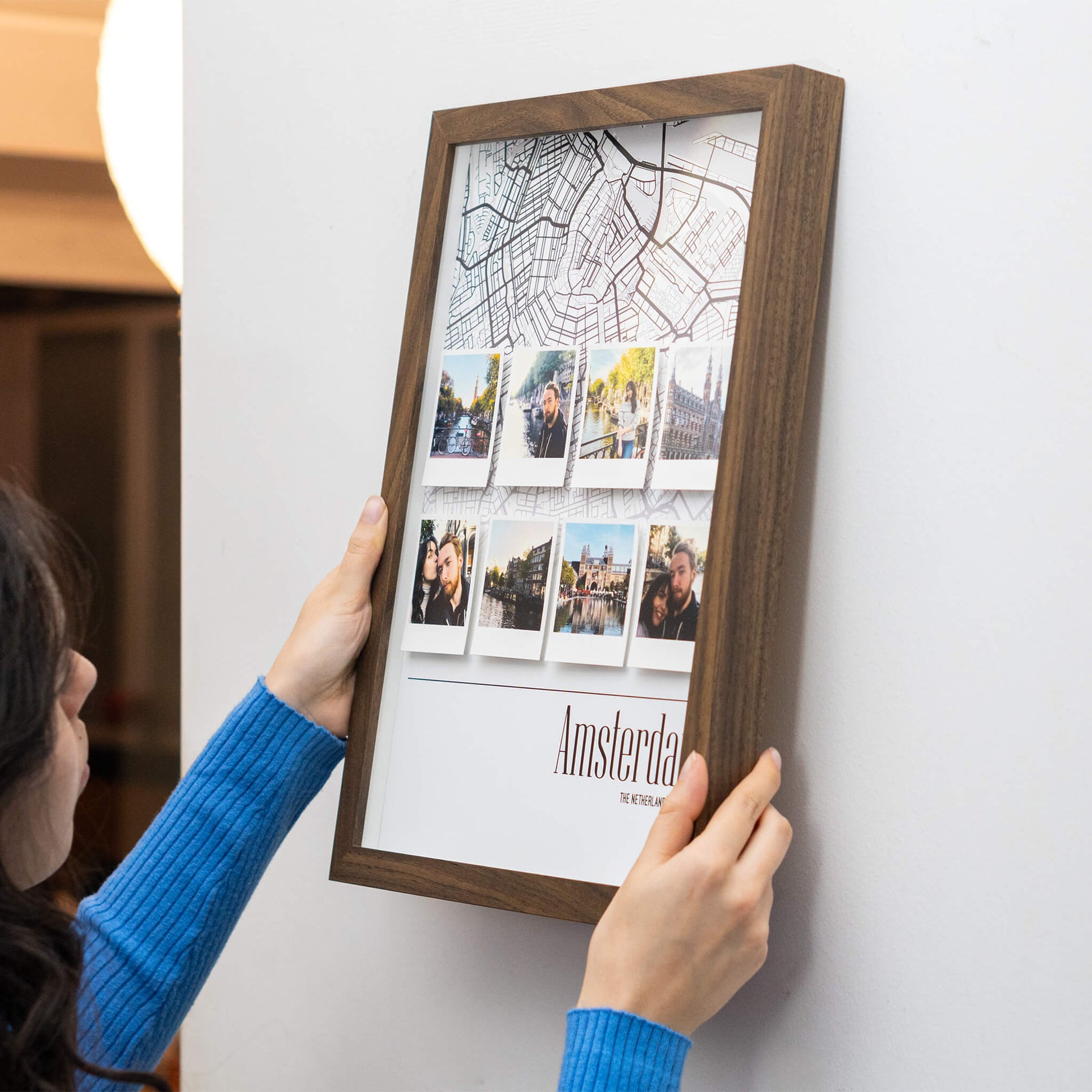 Vyberte si ľubovoľné miesto na svete, ktoré poslúži ako pozadie pre vaše obľúbené fotografie, ktoré sú elegantne uchytené 6 mm nad mapou, čím vytvárajú dojem, že sa vznášajú nad povrchom. Tento elegantný obraz zachytáva vaše dobrodružstvá a slúži ako ideálna dekorácia do interiéru alebo ako nápaditý darček, ktorý oslávi okamihy z vašich dovoleniek.