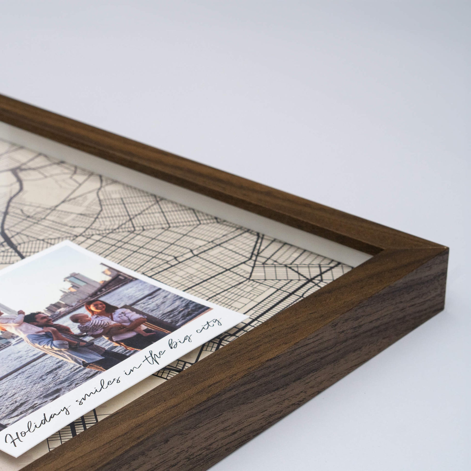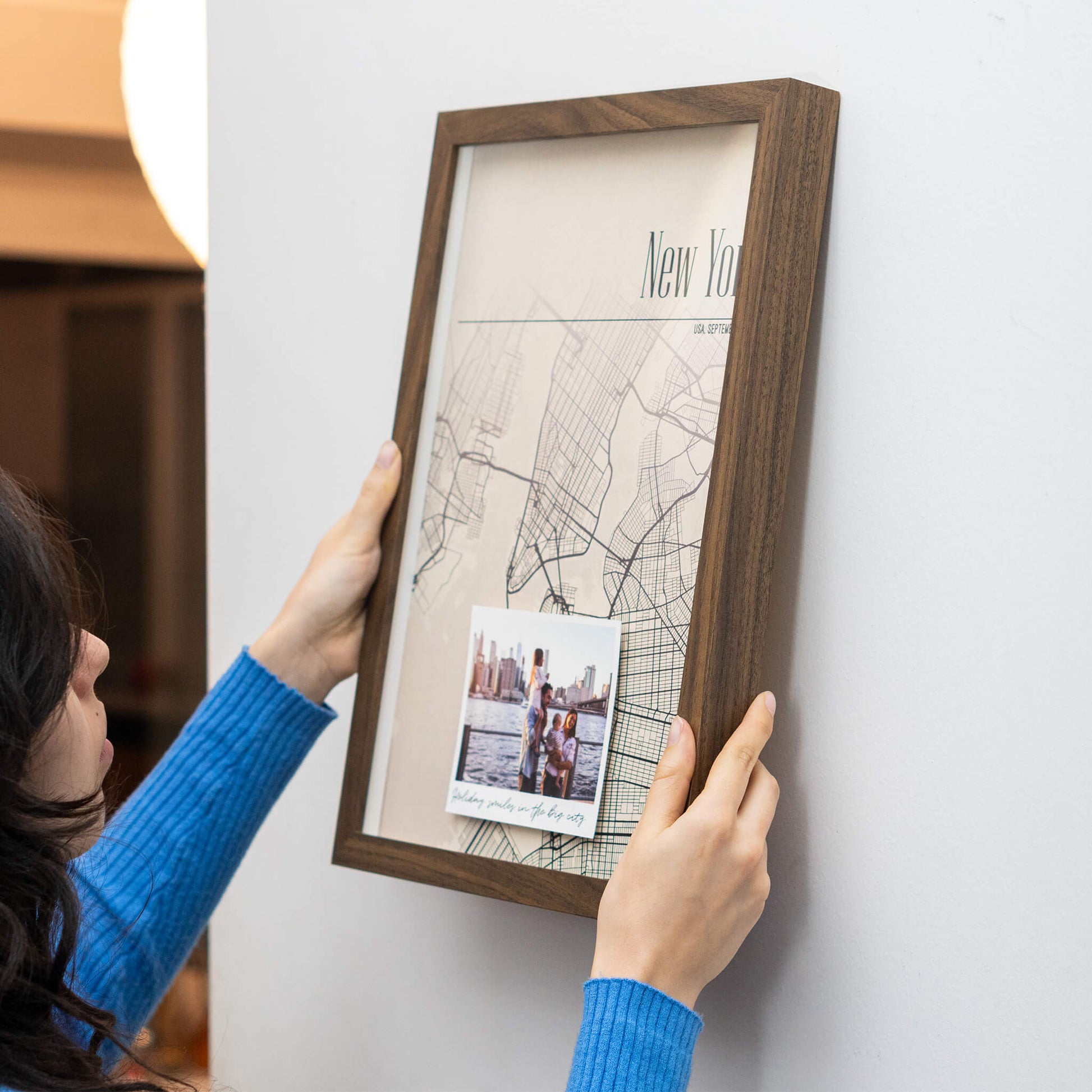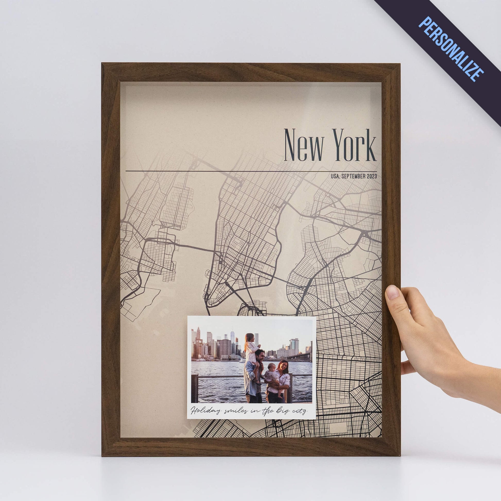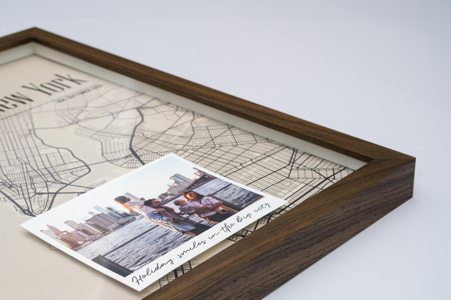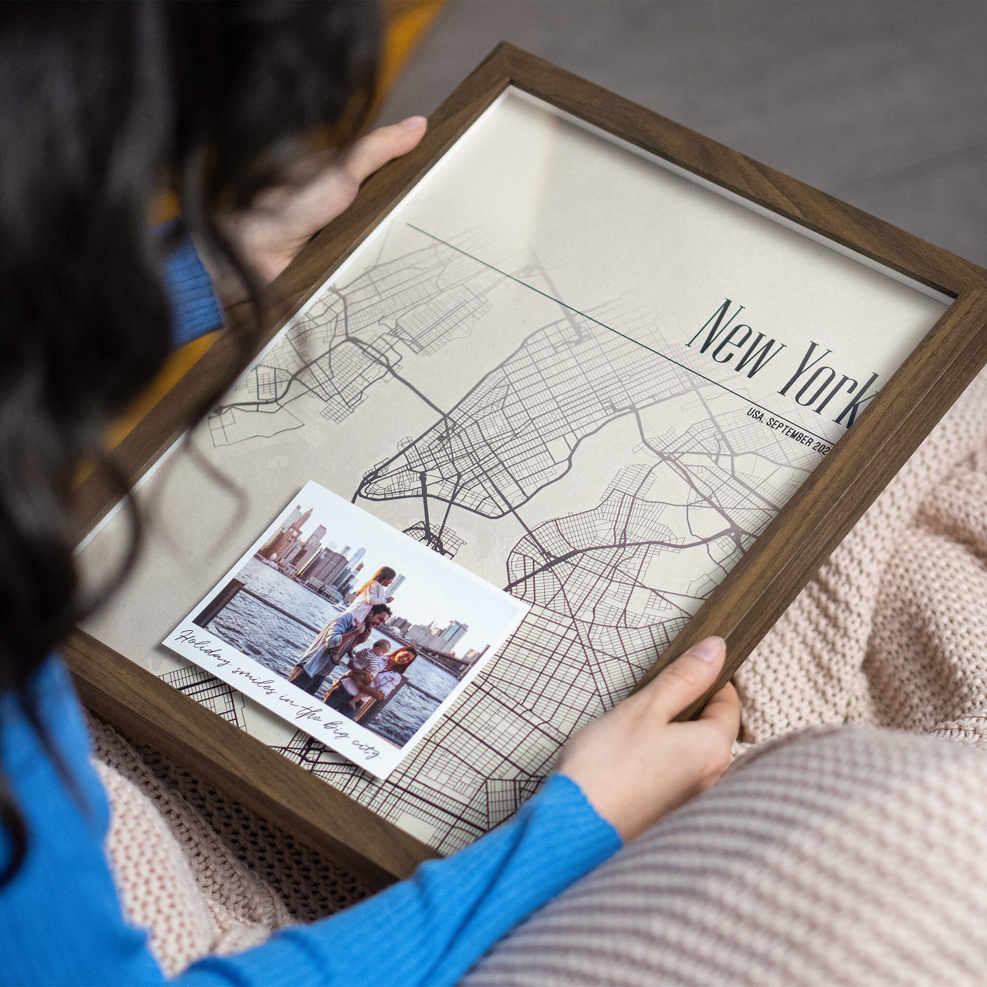 Vyberte si ľubovoľné miesto na svete, ktoré poslúži ako pozadie pre vaše obľúbené fotografie, ktoré sú elegantne uchytené 6 mm nad mapou, čím vytvárajú dojem, že sa vznášajú nad povrchom. Tento elegantný obraz zachytáva vaše dobrodružstvá a slúži ako ideálna dekorácia do interiéru alebo ako nápaditý darček, ktorý oslávi okamihy z vašich dovoleniek.