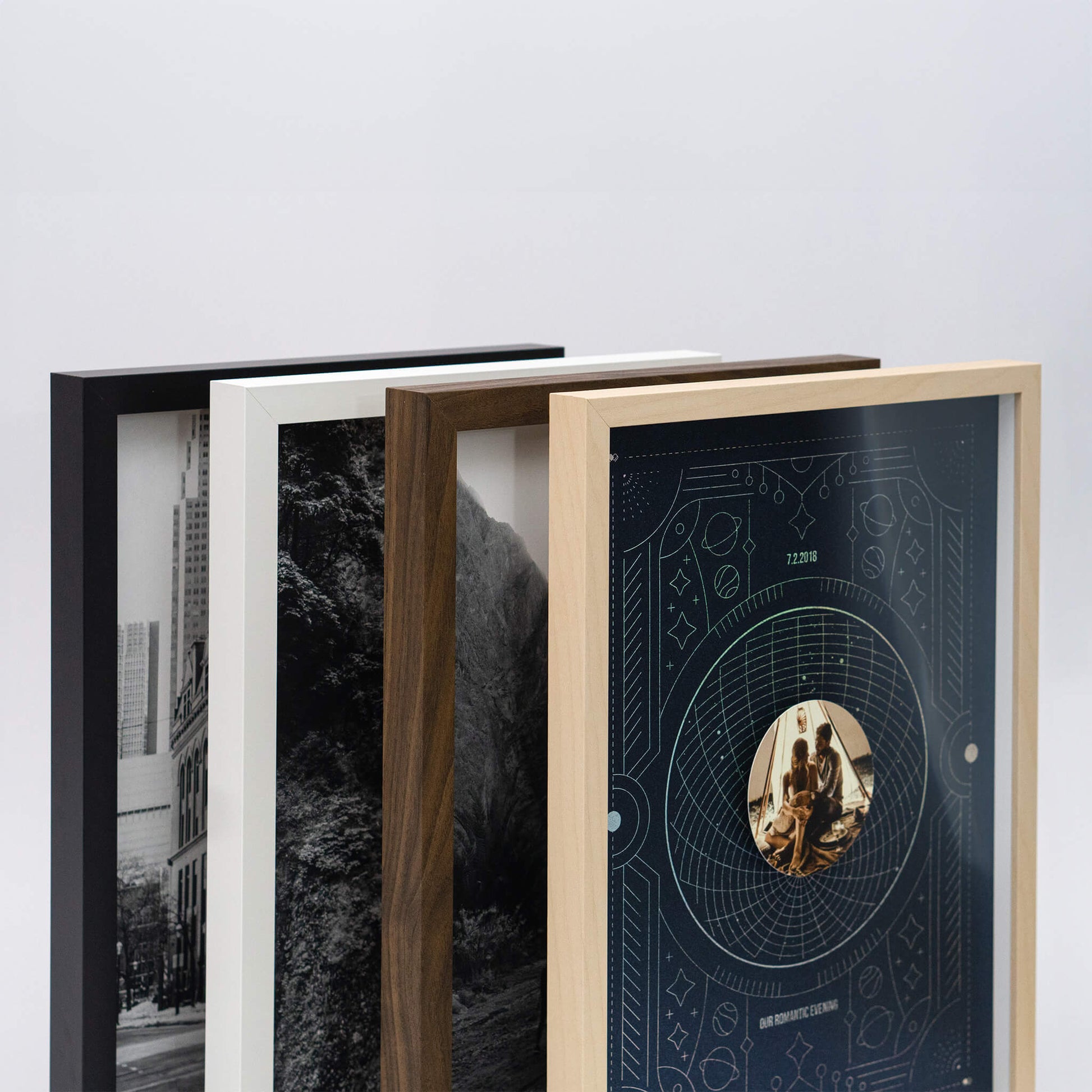 Fotografie sú uchytené 6 mm nad pozadím, čo vytvára nádherný vznášajúci sa efekt vo vnútri rámu. Tento detail dodáva každému obrazu moderný a sofistikovaný vzhľad.