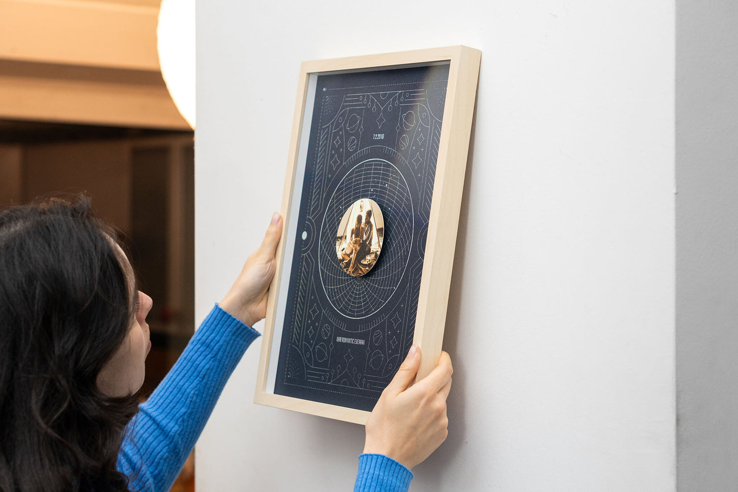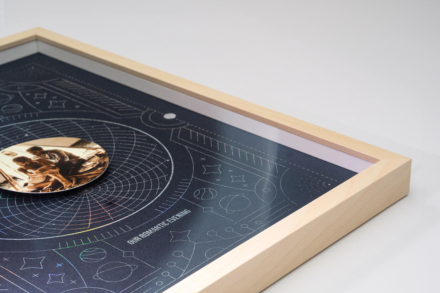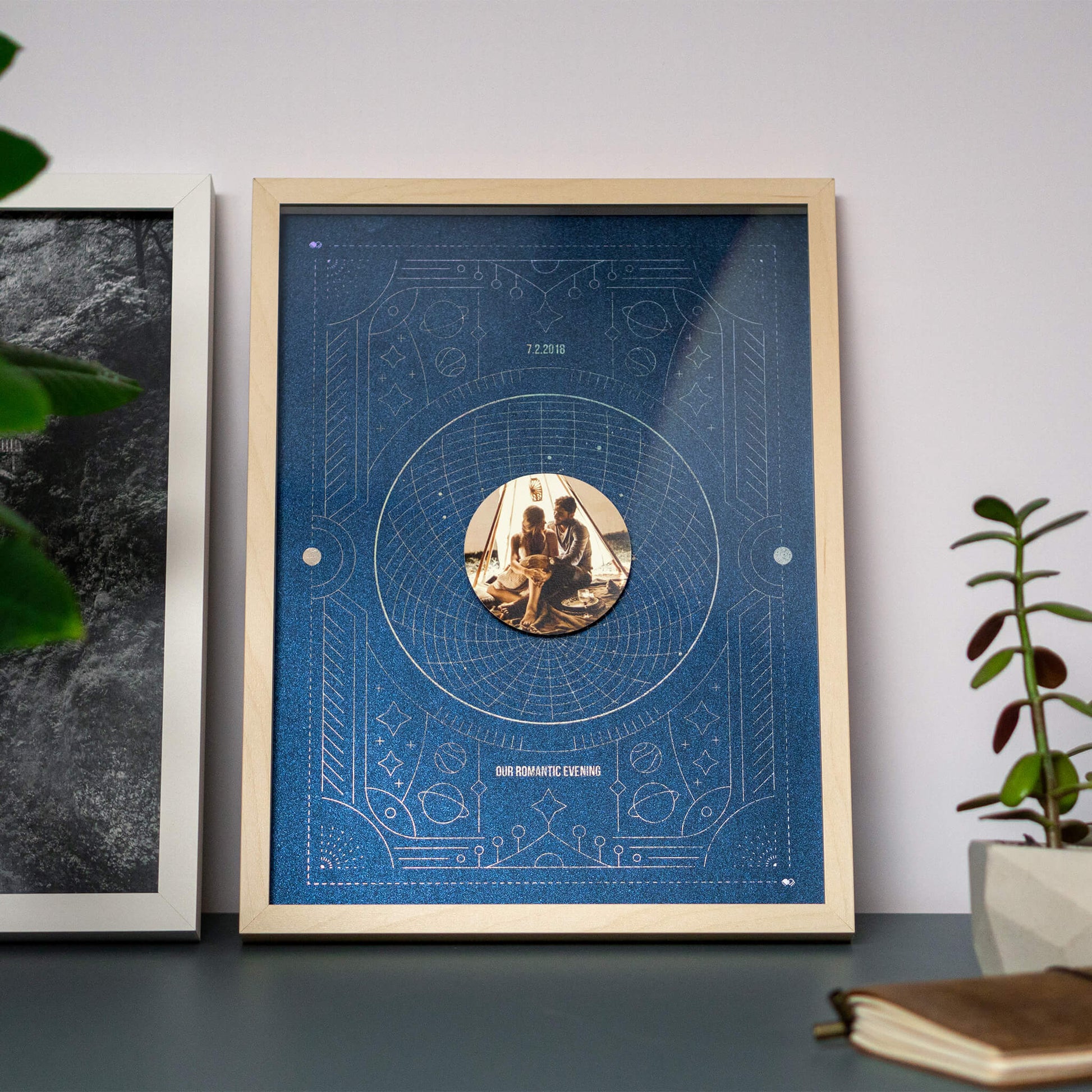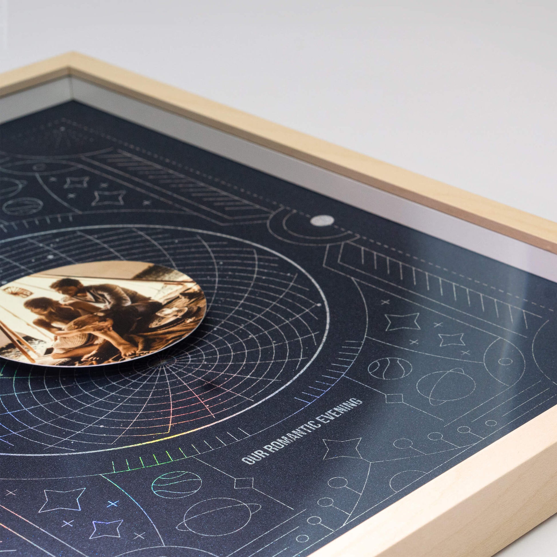 Vyberte si akýkoľvek významný dátum - či už je to deň, keď ste sa zoznámili, vaša svadba, alebo iný významný medzník - a my zachytíme súhvezdia tejto konkrétnej noci. Hviezdna mapa je elegantne vytlačená holografickou fóliou, ktorá sa trbliece rovnako ako hviezdy na oblohe. Vaše vybrané fotografie sú elegantne uchytené 6 mm nad týmto nebeským pozadím, čo vytvára očarujúci pocit hĺbky, akoby sa vznášali medzi hviezdami. Je to galaxia vašich spomienok, jedinečne zarámovaná na vašej stene.
