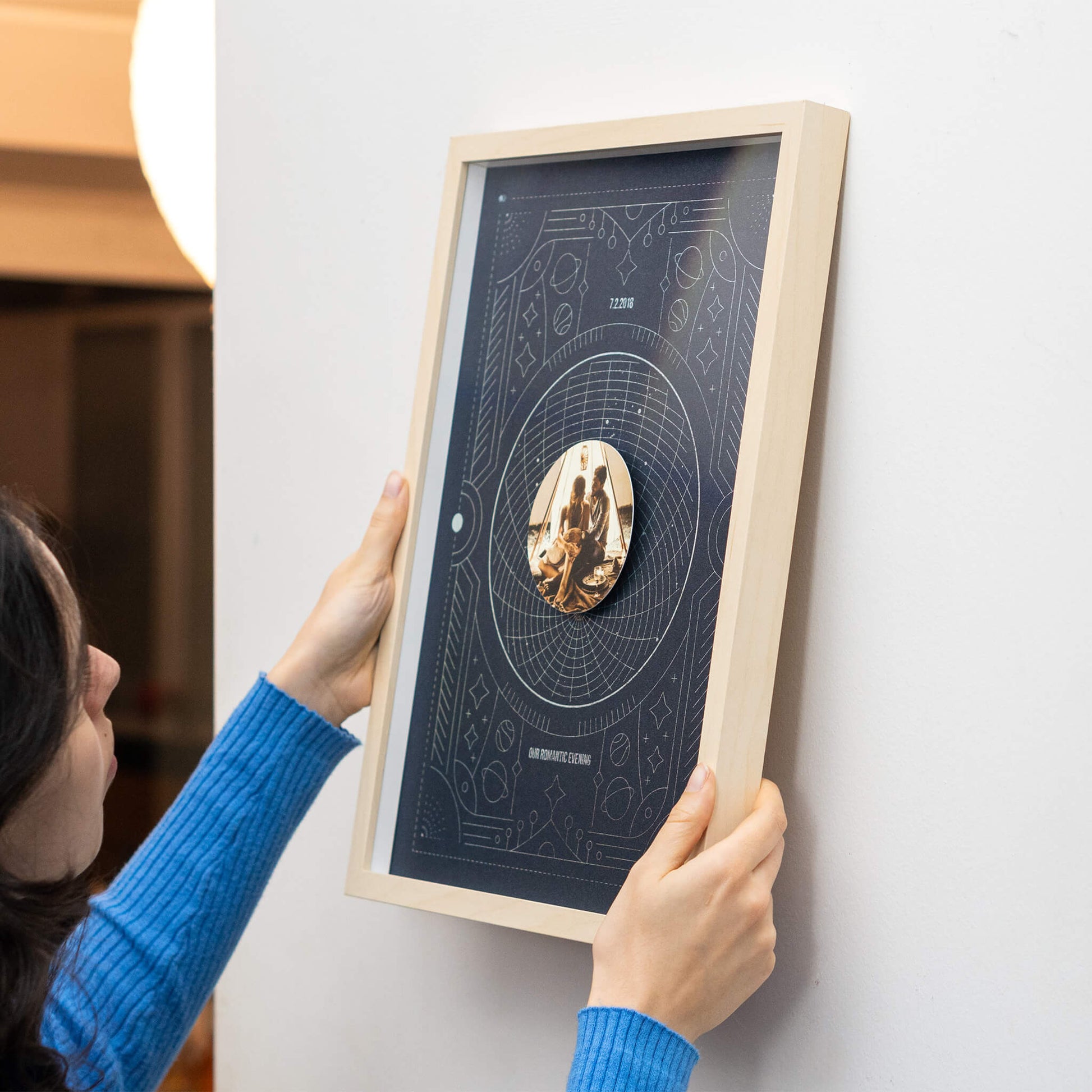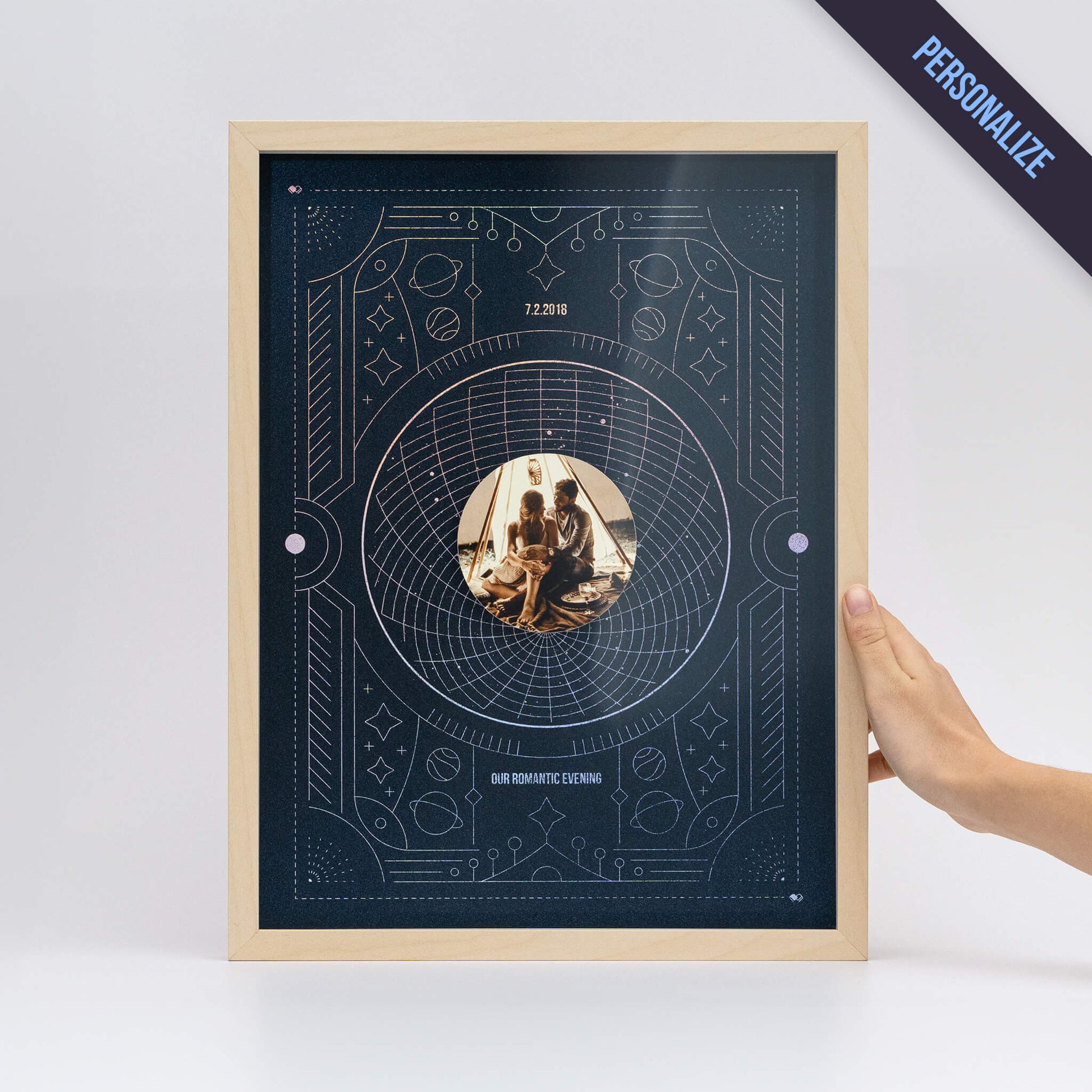 Obraz si personalizujete hviezdnou mapou z vášho významného dňa a vlastnou fotografiou, vďaka čomu sa stane dokonalou spomienkou na vaše jedinečné okamihy.